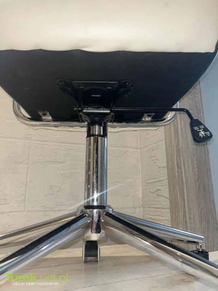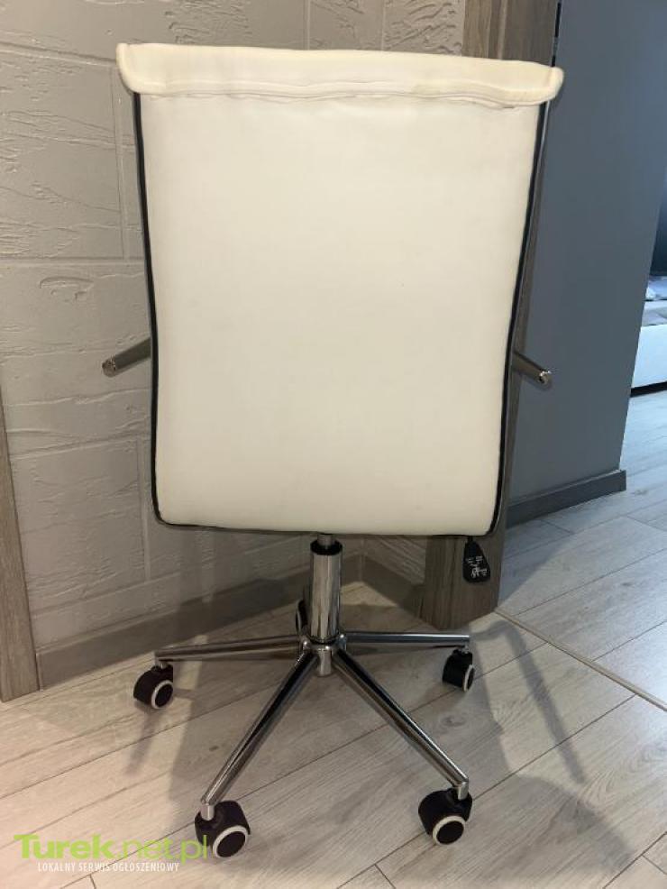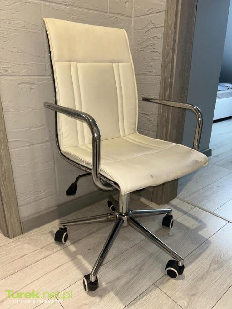Sprzedam krzesło biurowe obrotowe w kolorze białym (eko skóra). Krzesło było używane, posiada widoczne przetarcia i lekkie pęknięcia na siedzisku (widoczne na zdjęciach), które są wyłącznie wizualne.