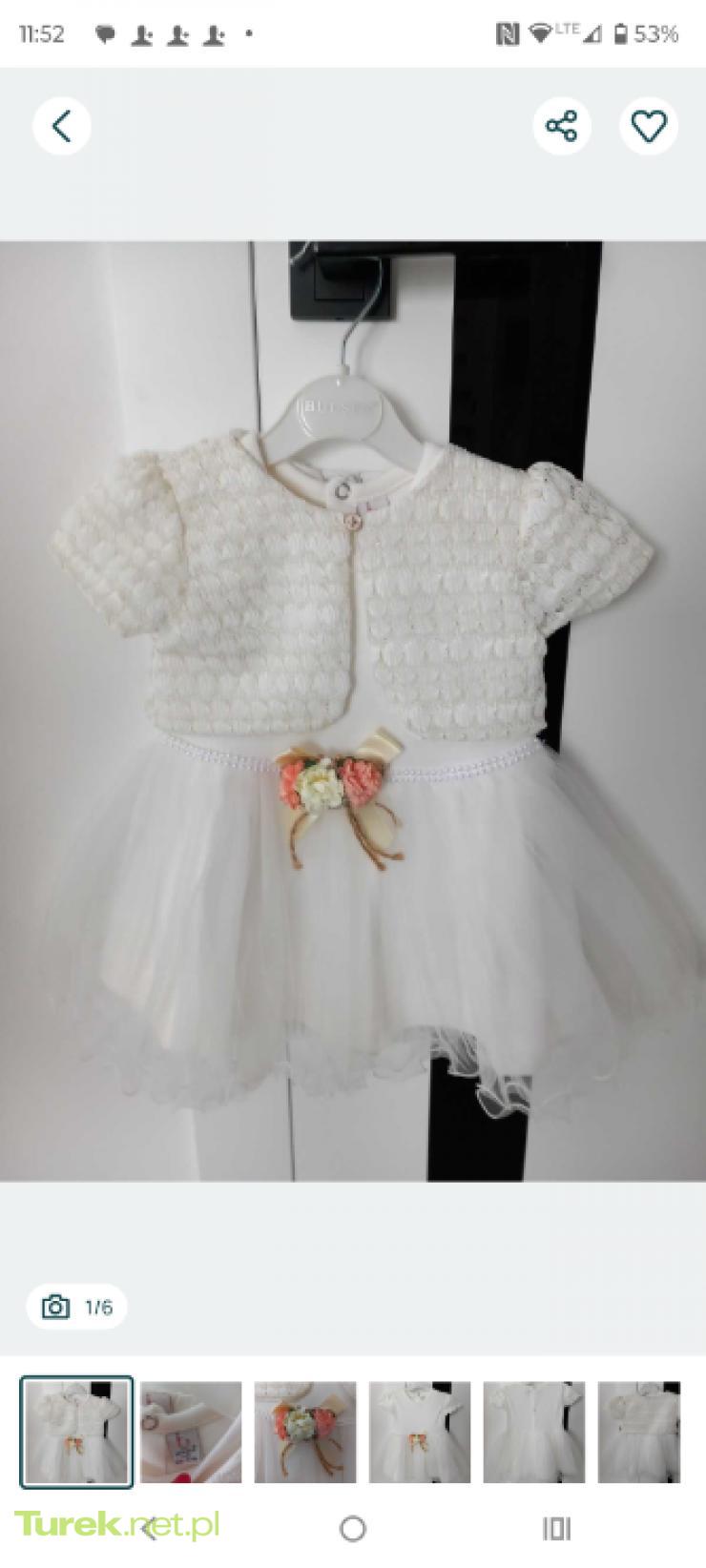 Sprzedam śliczną nigdy nie użytą sukieneczkę w rozmiarze 80 (jest to małe 80) pasującą zarówno na chrzciny, jak i na roczek lub inne uroczystości. Do sukieneczki dołączone jest eleganckie sweterkowe bolerko ze złotą nitką. W zestawie jest również ozdobna broszka, którą można odpiąć. Długość sukienki to 42 cm. Polecam!