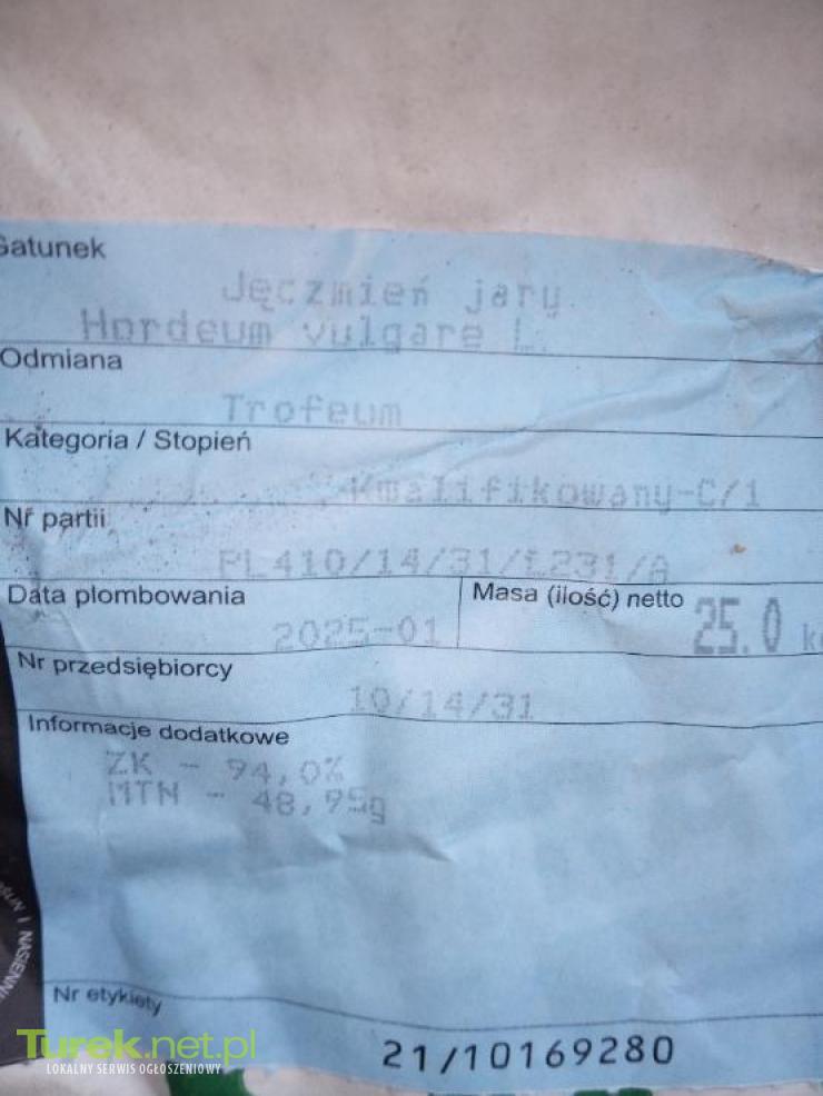 Sprzedam jęczmień jary odmiany TROFEUM po kwalifikacje C/1.Gm Brudzew.