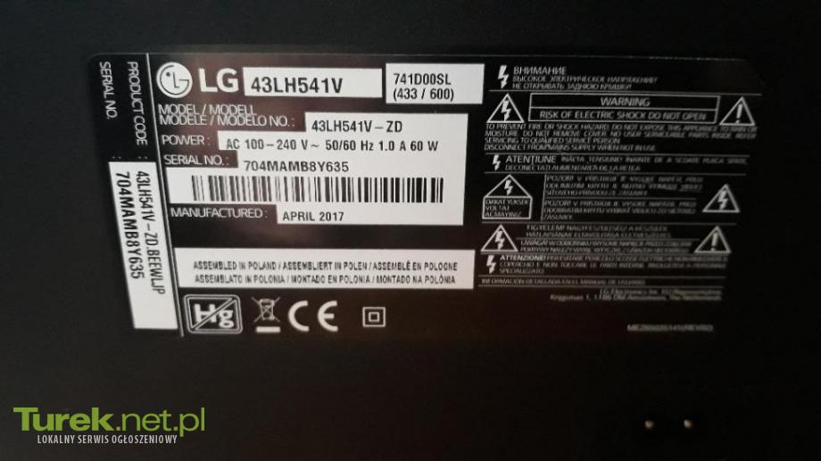 Telewizor LG 43LH541V, o przekątnej 43 cale. Telewizor ma wbudowany tuner DVBT2-HEVC. 2 x HDMI, 1 x USB, wejście na dysk. Używany, w bardzo dobrym stanie, bardzo mało używany. Sprawdzony produkt marki LG, który zapewni doskonałą jakość...