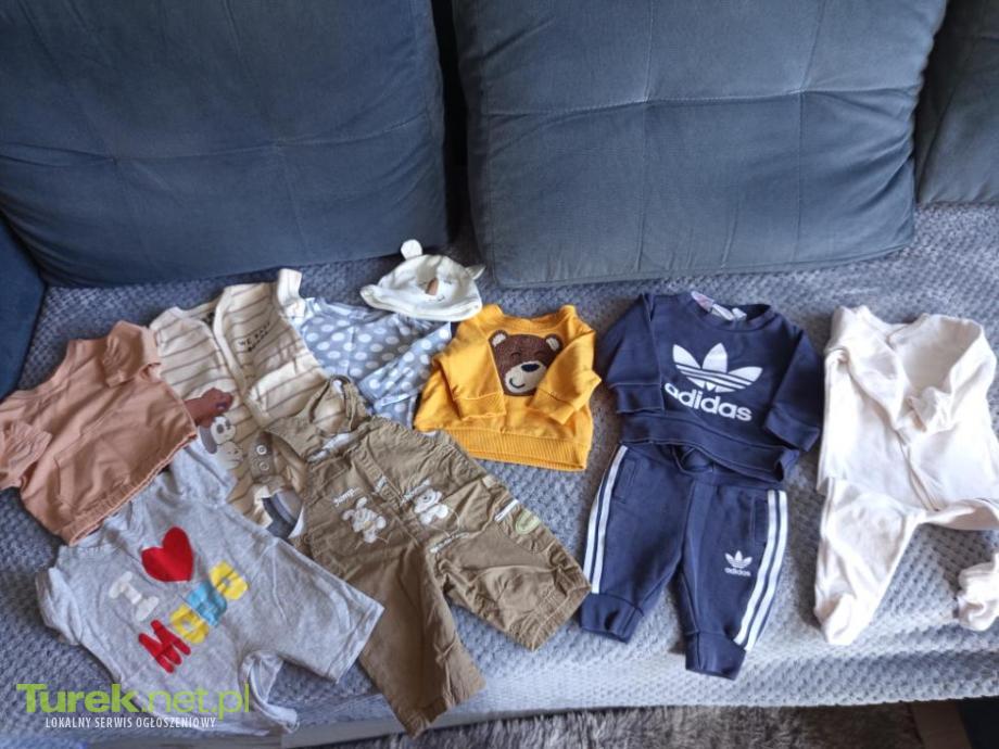 Ubranka dla chłopca rozmiar 56 62 68 spodnie, body, śpiochy, bluzki, dres Adidas, Myszka Miki, kombinezon zimowy misiowy, kilka czapek, skarpetki