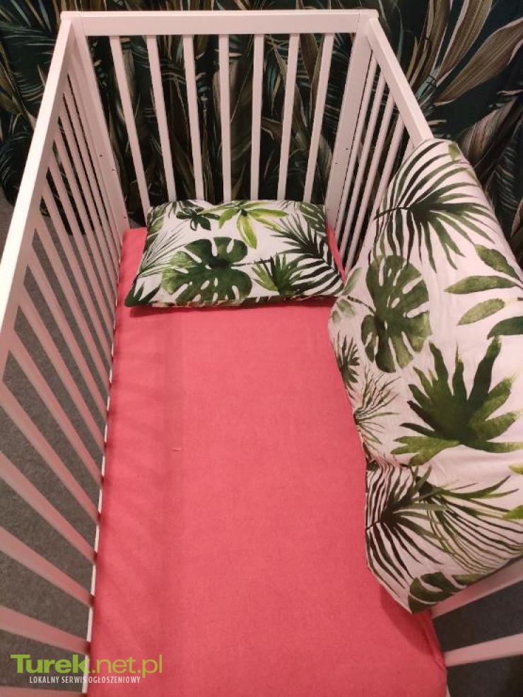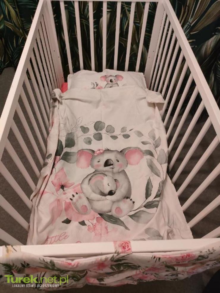 Łóżeczko dziecięce regulowane na dwie wysokości z materacem, organizerem, kołderką, poduszką, dwiema zmianami pościeli i dwoma prześcieradłami. Łóżeczko nieużywane.