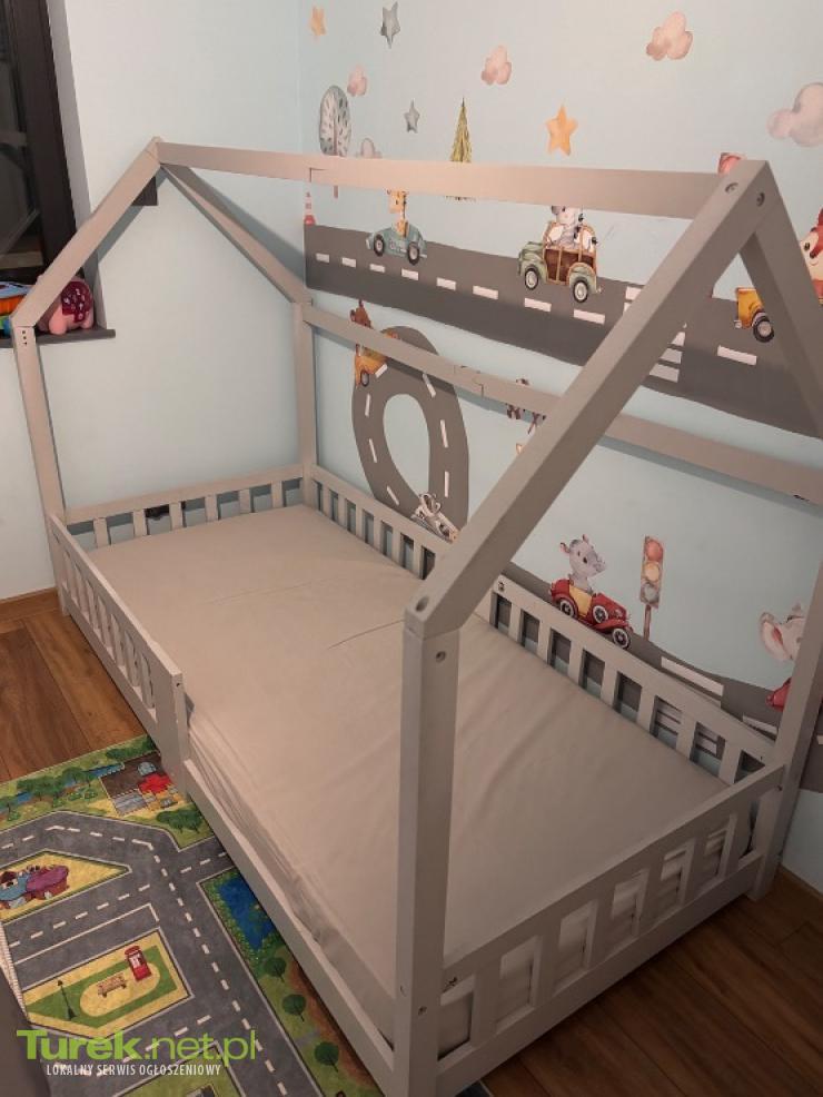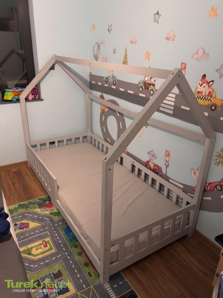 Łóżeczko domek z pojemną szufladą, szczebelkami i materacem. Wymiary 165 długość x 85 x 180 wysokość. Materac grubość 17 cm, pianka i kokos z firmy MDM, materac nie ma żadnych plam. Łóżko jest sosnowe, jedynie skrzynia jest z...