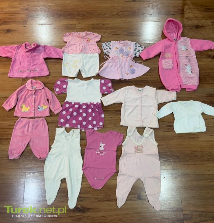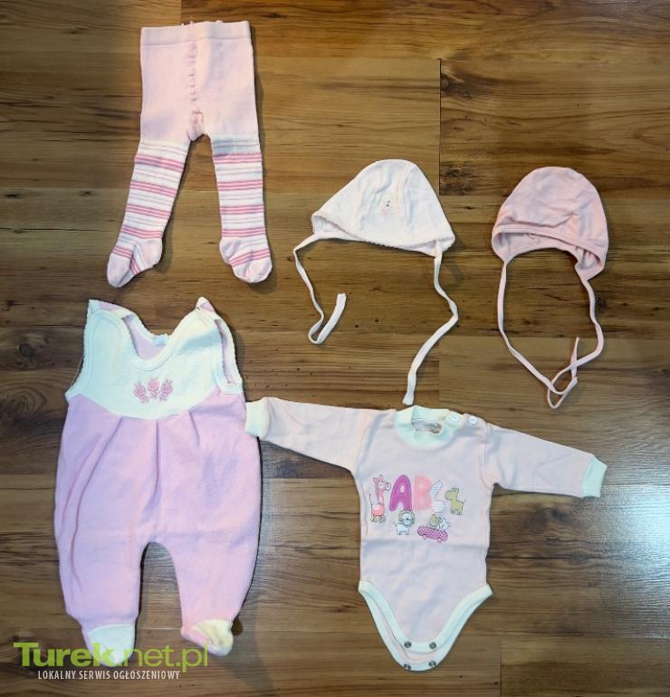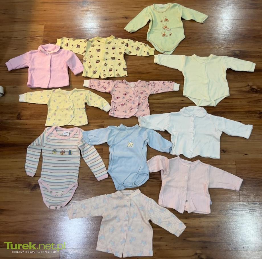 Ciuszki na dziewczynkę (po jednym dziecku) rozmiar 56, 13 sztuk (body, śpiochy, kaftaniki, pajacyki) + rajstopy i dwie czapeczki. Głównie 100% bawełna.