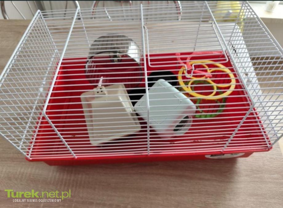 Sprzedam klatkę dla chomika z akcesoriami dwa kołowrotki - jeden nowy dwie miski - nowe , dwa domki - jeden nowy. Cena za całość 50 zł. Wymiary : 45x29x23. W niektórych miejscach farba zeszła ze szczebelek ale to nie przeszkadza w...