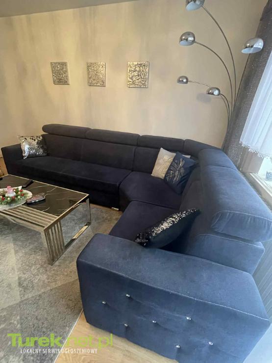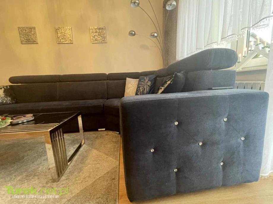 Sprzedam kanapę narożnikowa z regulowanymi zagłówkami. wymiary: 300 x 200 [cm], głębokość siedziska 50 cm kolor granatowy, na zewnętrznych stronach oparcia wysadzana ozdobnymi kryształkami. w zestawie otwierana pufa ze schowkiem....