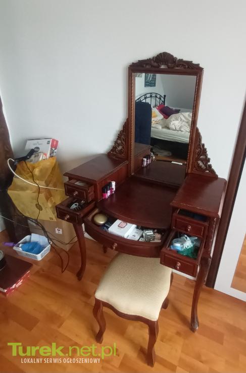 Stylowy, drewniany toaletka wraz z dwoma szafkami nocnymi w ciemnobrązowym kolorze. Mebel jest w dobrym stanie, idealny do sypialni