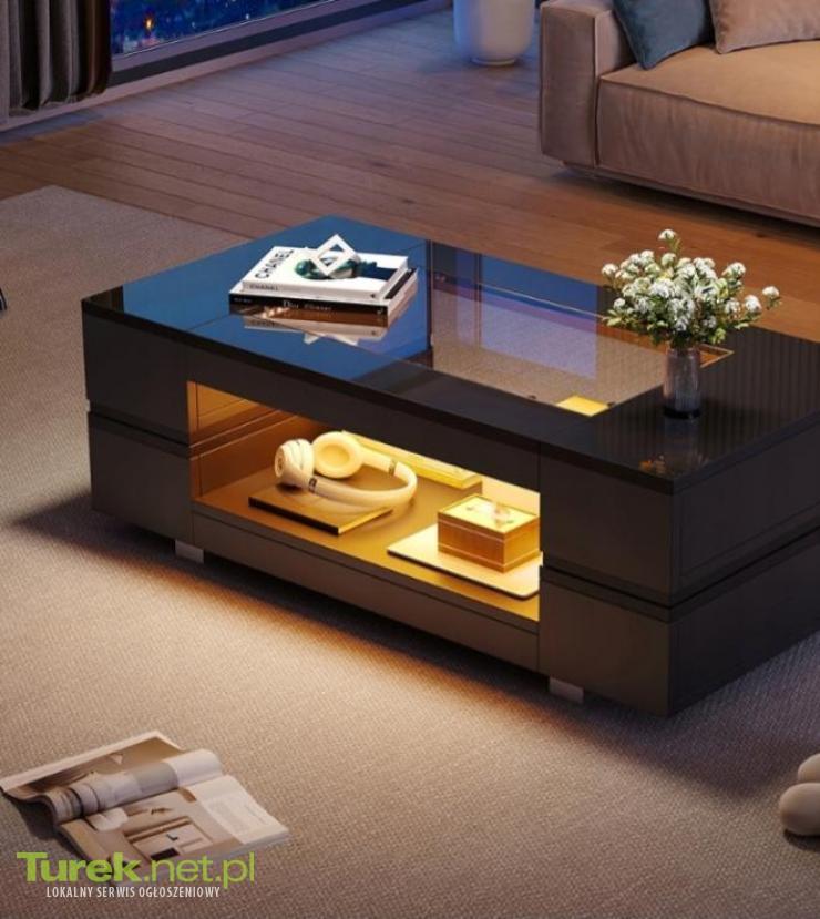 Czarny stolik kawowy LED z aplikacją Bluetooth, dwupoziomowy stolik z błyszczącym wykończeniem i wgłębionym wzorem, idealny na imprezy, do biur i salonów Główny kolor: Czarny Główny materiał: Płyta wiórowa, szkło hartowane Wymiary...