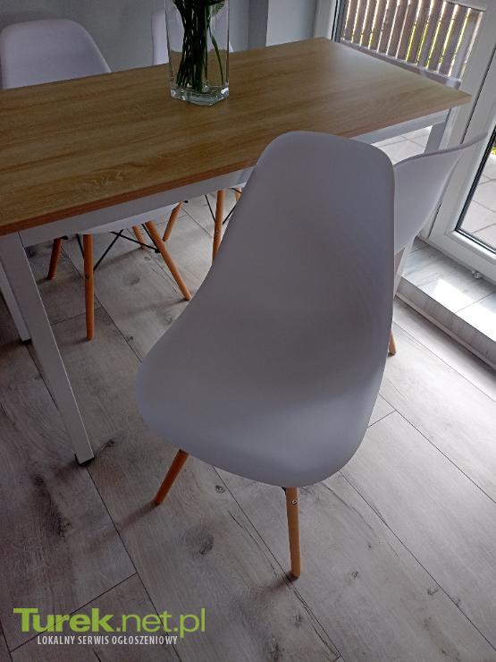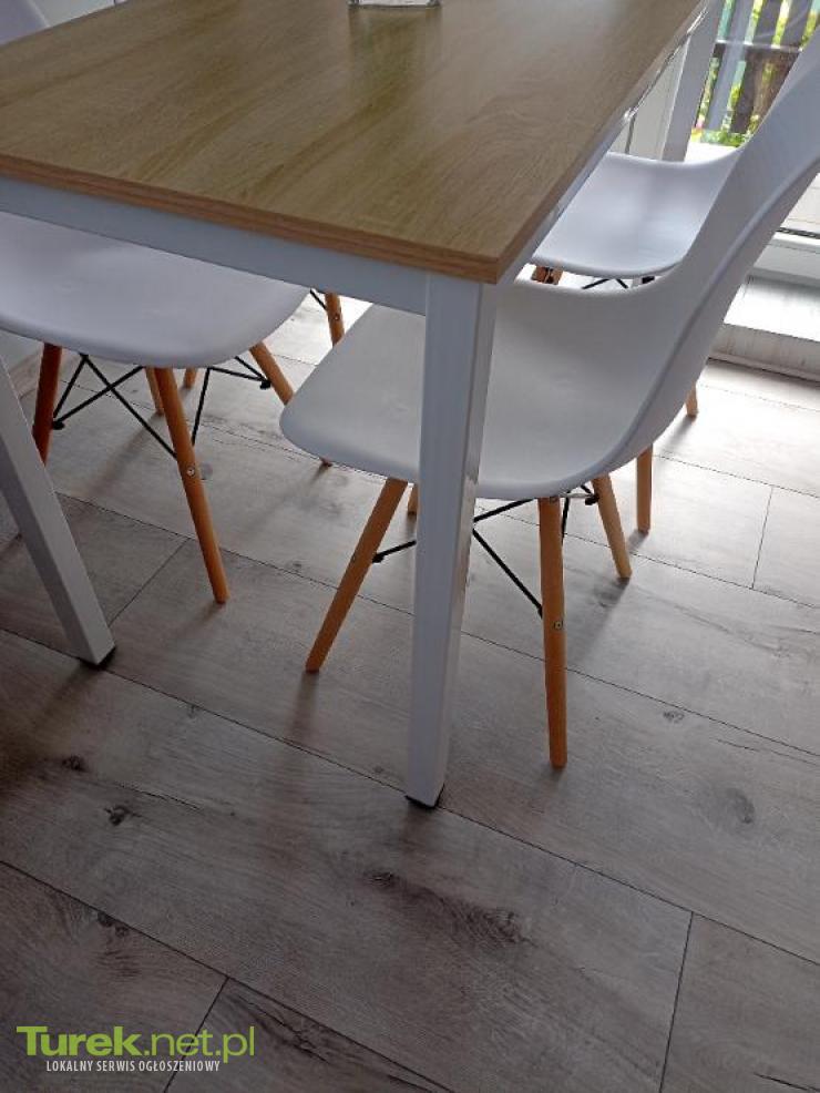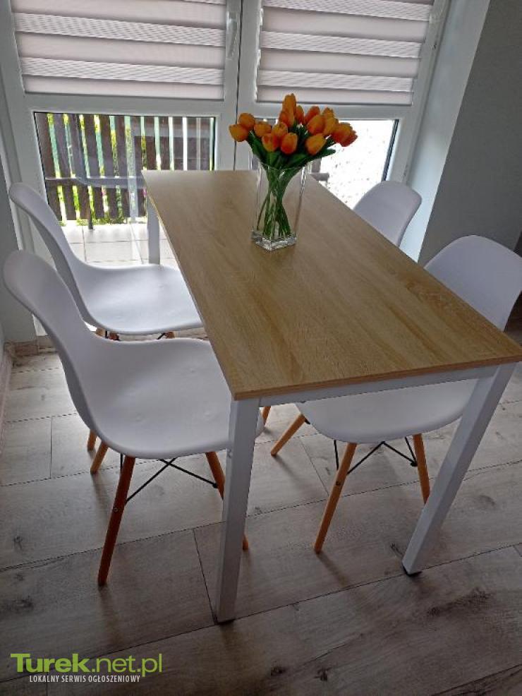 Sprzedam stół z 4 krzesłami, stół w kolorze jasny dąb z metalowymi nogami w kolorze białym, krzesła w kolorze białym a nogi drewniane bukowe. Wymiary stołu: szerokość 120cm, długość 60cm, wysokość 75cm. Wymiary krzesła:...