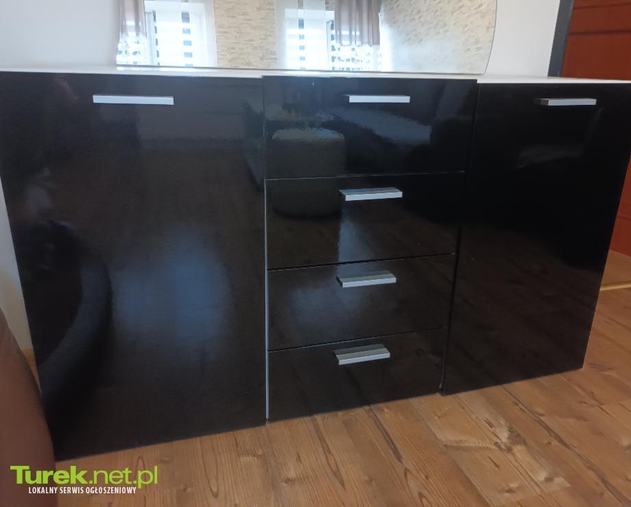 Komoda czarna lakierowana, 4 szuflady, po bokach półki. Stan bardzo dobry, miejscami małe otarcie. Długość 135cm, szerokość 40cm, wysokość 79cm. Możliwość dokupienia lustra do kompletu , stan bardzo dobry, lustro ciężkie masywne....