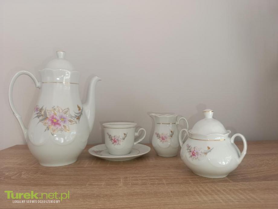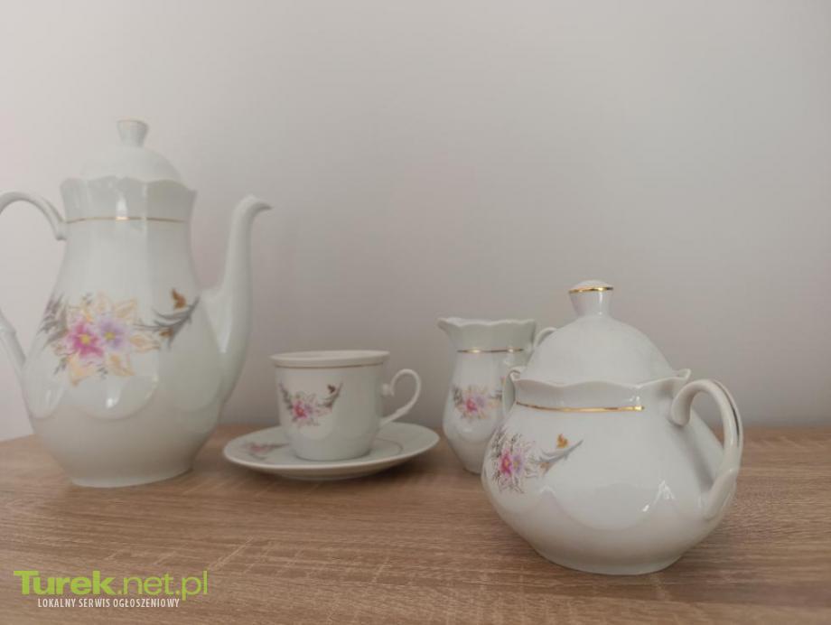 Elegancki serwis do kawy z delikatnymi kwiatowymi motywami. Składa się z dzbanka, mlecznika , cukiernicy, 11szt filiżanek ze spodkiem, 11 talerzy. Wykonany z wysokiej jakości porcelany marki Lubiana.