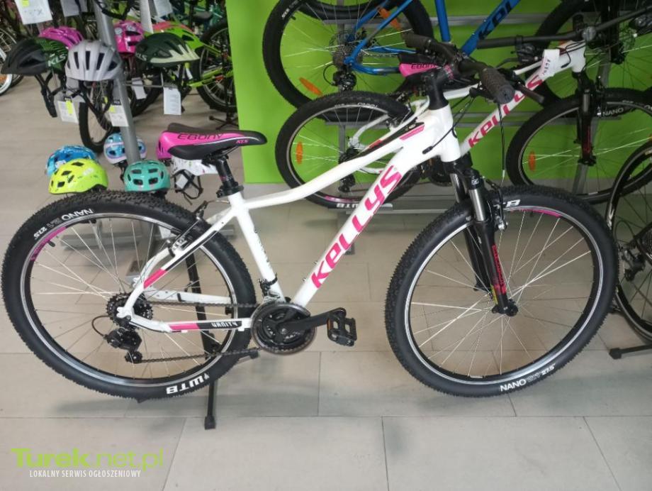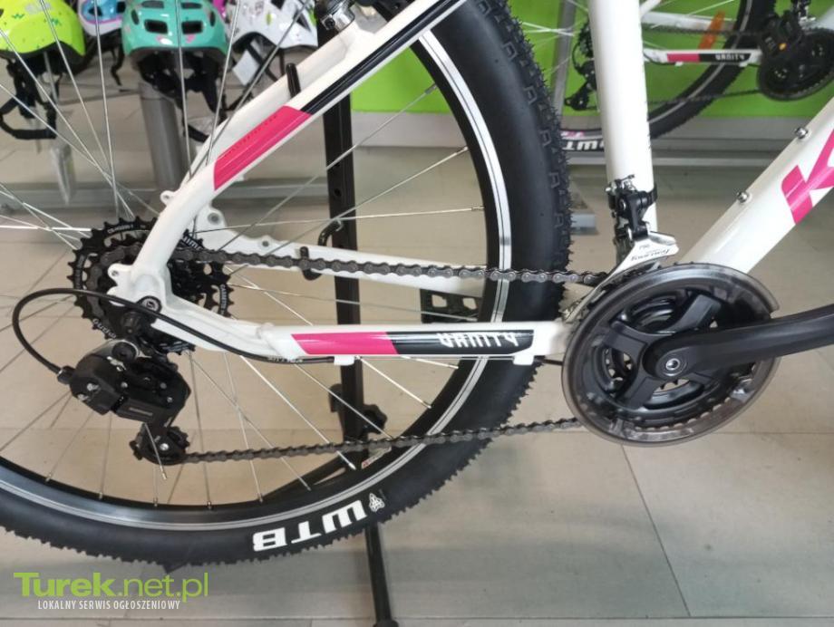 Rower Kellys model : Vanity 10 rozmiar ramy M . Koła rozmiar 27,5 Biały . Rama : aluminium Amortyzator : RS Suntour XC E28 Przerzutki przód i tył : Shimano Klamkomanetki : Shimano 3 biegi z przodu , 7 biegów z tyłu Hamulce : typu V - Break...