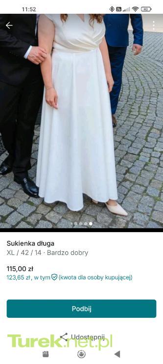 Do sprzedania sukienka w kolorze ecru,w rozmiarze xl. Długość 147 cm, szerokość w ramionach mierzona na płasko 38 cm, szerokość w pasie mierzona na płasko 94 cm. Z boku sukienki delikatne rozcięcie. Założona tylko raz,idealna na ślub...