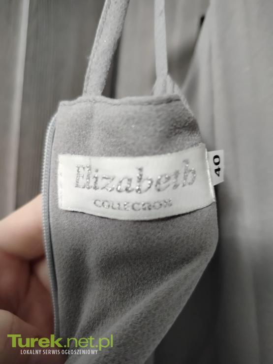 Sprzedam długą sukienkę koloru szarego z brokatem, rozmiar 40, firmy Elizabeth, stan bardzo dobry, do obejrzenia okolice Władysławów lub wysyłka.