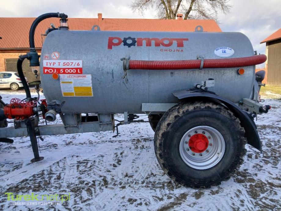 Sprzedam beczkowóz Pomot Chojna model T 507/6 5000l Rok produkcji 2018 Beczka w wersji premium mocniejsza pompa. Boczny zawór szklany wziernik wysokie koła 500/70R /22,5 bardzo lekko idzie za traktorem . Wąż wylewka i książka instrukcji...