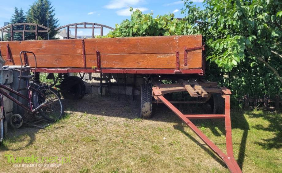 Przyczepa dwuosiowa na ramie metalowej, skrzynia drewniana Wymiary: długość 3,75 m Szerokość: 1.55 m Wysokość 1,40 m