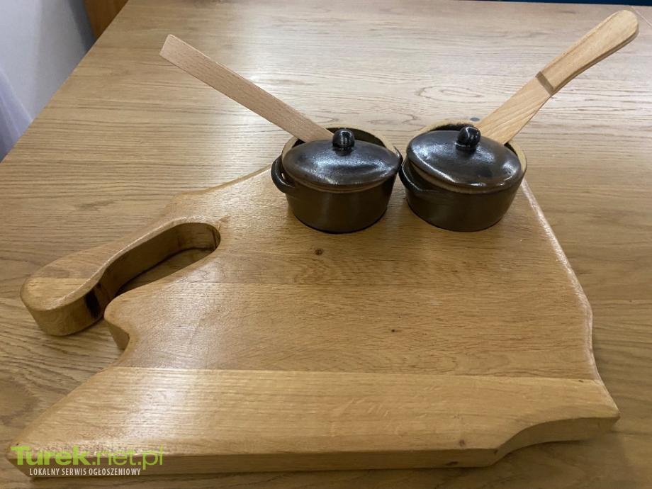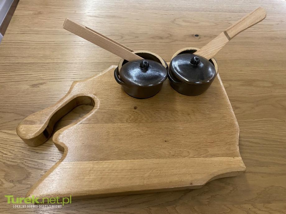 Sprzedam dębową deskę do serwowania wędlin. Cały zestaw z dwoma kamionkami nóż i szczypce. Cały zestaw widoczny na zdjęciach. Więcej informacji udzielę telefonicznie pod numer telefonu 697874890. Zapraszam do kontaktu.