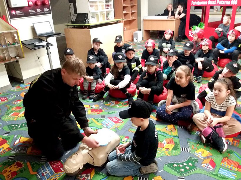 Najmłodsi adepci sztuki pożarniczej, pod okiem opiekunów i funkcjonariuszy komendy, ćwiczyli w sali edukacyjnej “Ognik” udzielanie pierwszej pomocy z użyciem AED. Przenośny defibrylator przeznaczony do szkoleń, jakim dysponuje KP PSP w Turku, pozwolił każdemu z uczestników zajęć poznać specyfikę i zasady obsługi urządzenia.