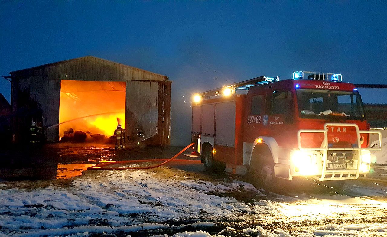 Jak przekazał st.kpt. Gruszczyński na miejsce pożaru zadysponowano 5 zastępów z PSP w tym 13 strażaków oraz 13 zastępów z jednostek OSP w ilości łącznie 75 druhów ochotników. - Po przybyciu na miejsce zdarzenia stwierdzono, że pali się wnętrze wiaty magazynowej. W momencie naszego przybycia cała wiata była objęta pożarem i zagrożone były sąsiednie budynki mieszkalne i gospodarcze. Nasze działania w pierwszej fazie polegały na zabezpieczeniu miejsca zdarzenia. Początkowo podano prądy wodne na w obronie tych sąsiednich budynków gospodarczych, w którym znajdowało się bydło oraz budynku mieszkalnego. W momencie, kiedy dojechały kolejne jednostki podano łącznie 8 prądów wody w natarciu na palącą się wiatę. Zadysponowano także pogotowie energetyczne. W palącej się wiacie znajdowała się głównie słoma, plony rolne, ale także maszyny rolnicze. W międzyczasie policja zablokowała ruch na lokalnej drodze i zorganizowała objazdy - relacjonuje st.kpt. Gruszczyński.