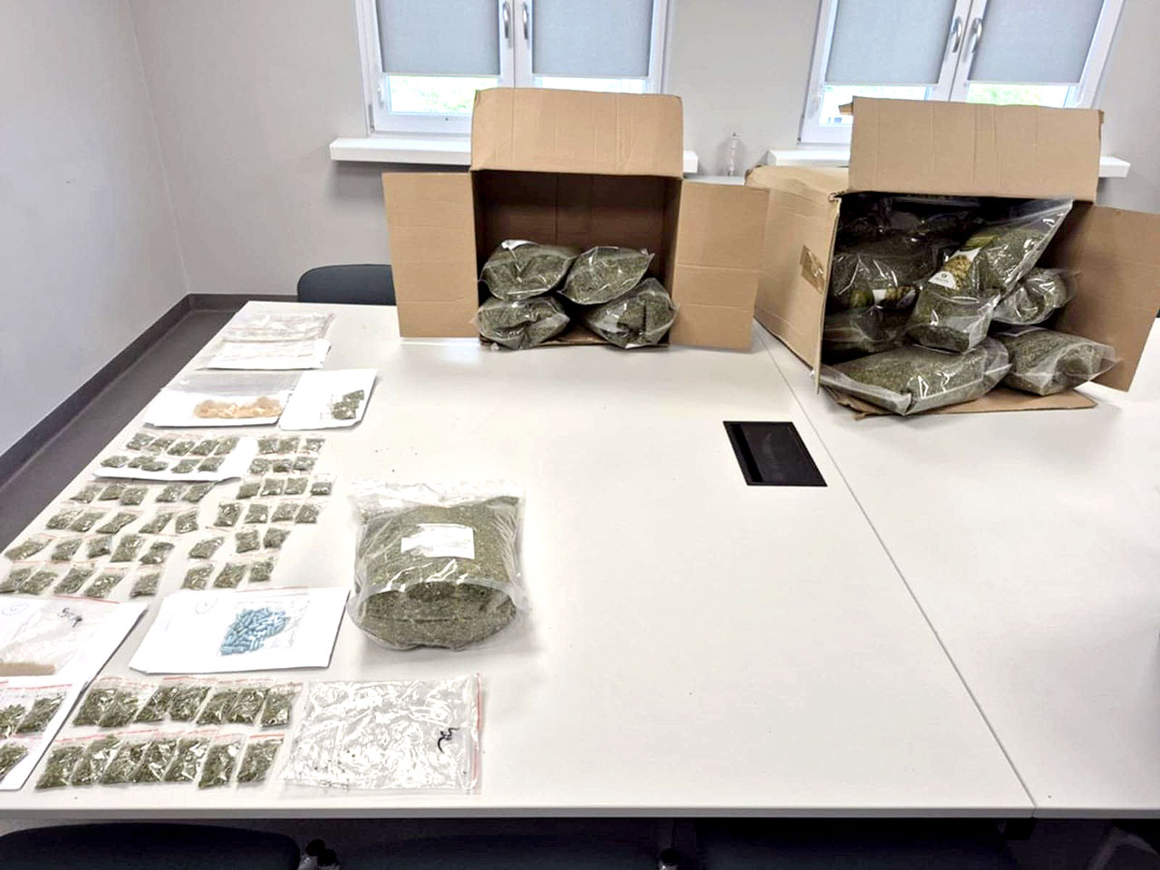 Policjanci dokonali przeszukań w pięciu lokalizacjach, w tym na terenie garażu i kontenera na działce użytkowanej przez zatrzymanego. Substancje — w postaci suszu, tabletek, kryształu i proszku — ujawniono pod dwoma adresami. Ich ilość i forma wskazują na profesjonalne przygotowanie do dystrybucji.