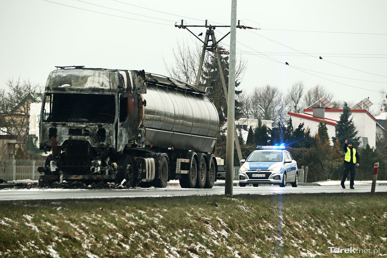 Pożar cysterny na al. Jana Pawła II w Turku. Kabina ciągnika spłonęła doszczętnie