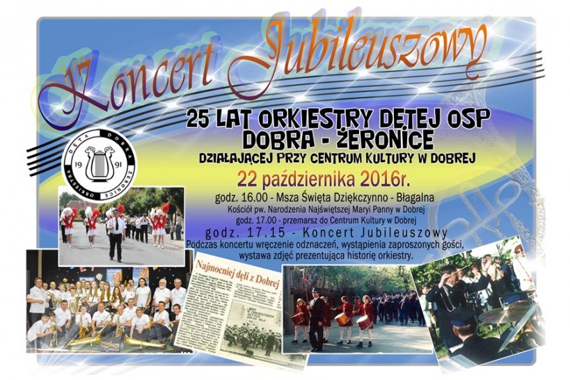 Obchody 25-lecia działalności odbędą się w sobotę 22 października. Rozpocznie je msza święta, odprawiona o godz 16:00 w Kościele pw. Narodzenia Najświętszej Maryi Panny w Dobrej. Około 17:00 uczestnicy wydarzenia przemaszerują do Centrum Kultury. Tam właśnie o 17:15 rozpocznie się jubileuszowy koncert. Jak informują Organizatorzy osoby, które pojawią się na widowni, obejrzą też wystawę zdjęć, prezentującą historię Orkiestry. Sobotni wieczór będzie także okazją do uhonorowania zasłużonych osób.