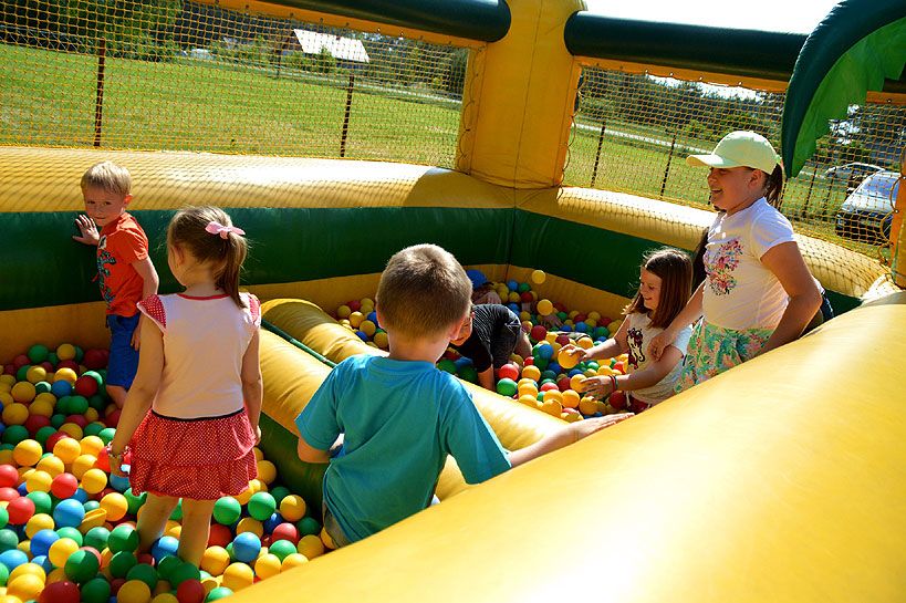 Choć niedzielne wydarzenie rozpoczęło się o godz. 15:00, to jednak na placu przy świetlicy wiejskiej gwarno było już od godzin porannych. 2 czerwca zjawiło się tam kilkanaście osób, by pod okiem liderek Gościńca – prezes Wioletty Durkiewicz oraz wiceprezes Agnieszki Samulskiej, przygotować teren spotkania, udekorować miejsce. Stowarzyszenie tworzą głównie panie, ale na boisku zjawili się również panowie – miejscowi tatusiowie, przyjaciele Gościńca, druhowie OSP – którzy zajęli się m.in. rozłożeniem pokaźnego namiotu. W międzyczasie nadmuchiwana była zjeżdżania, pojawił się również basen z piłeczkami.