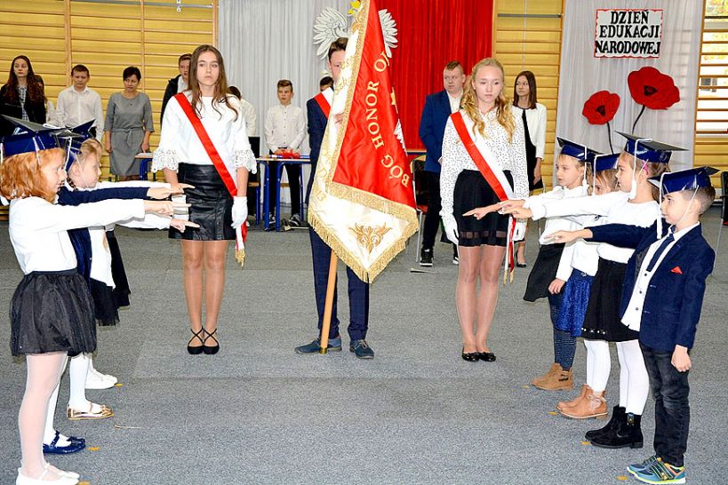 W pierwszej części uroczystości dzieci oraz młodzież mieli okazję podziękować wszystkim pedagogom za ciężką pracę i trud włożony w ich edukację, wychowanie i opiekę. Z okazji Święta Edukacji Narodowej uczniowie przygotowali występy artystyczne, podczas których śpiewająco wypowiedzieli się na temat szkolnego życia oraz pracy nauczycieli. Pod okiem wychowawczyń klas 1 pierwszaki zostały przyjęte w poczet "świeżo upieczonych" uczniów, dla których rozpoczęła się nowa szkolna przygoda. Aktu ślubowania dokonał dyrektor szkoły Marek Milczarek.