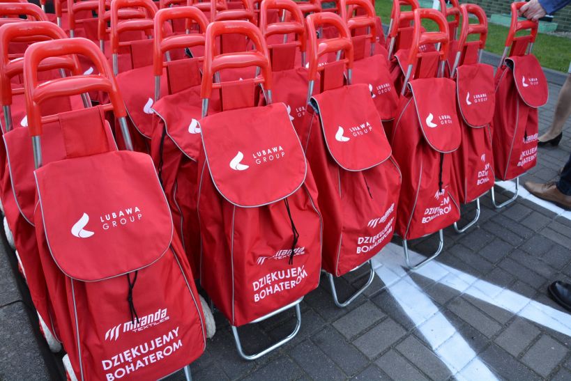 Serdeczne podziękowania od Starosty Dariusza Kałużnego i Wicestarosty Władysława Karskiiego zostały przekazane Prezesowi Grupy Lubawa Marcina Kubicy oraz Prezesowi Zarządu Miranda Textiles Grzegorzowi Dybusowi za podarowanie komfortowych toreb zakupowych na wózkach zawierających środki ochrony osobistej dla najbardziej potrzebujących, w tym kombatantów, sybiraków i weteranów.