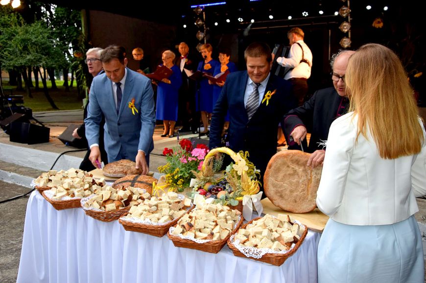 W tym roku w rolę starostów dożynek pełnili Aneta Żerkowska i Daniel Juszczak. Przekazali oni chleb wypieczony z tegorocznych ziaren na ręce gospodarza gminy. W swoim przemówieniu Burmistrz Krzysztof Roman docenił trud i ciężką pracę rolników. Podziękował też wszystkim zaangażowanym w organizację tegorocznych dożynek.
