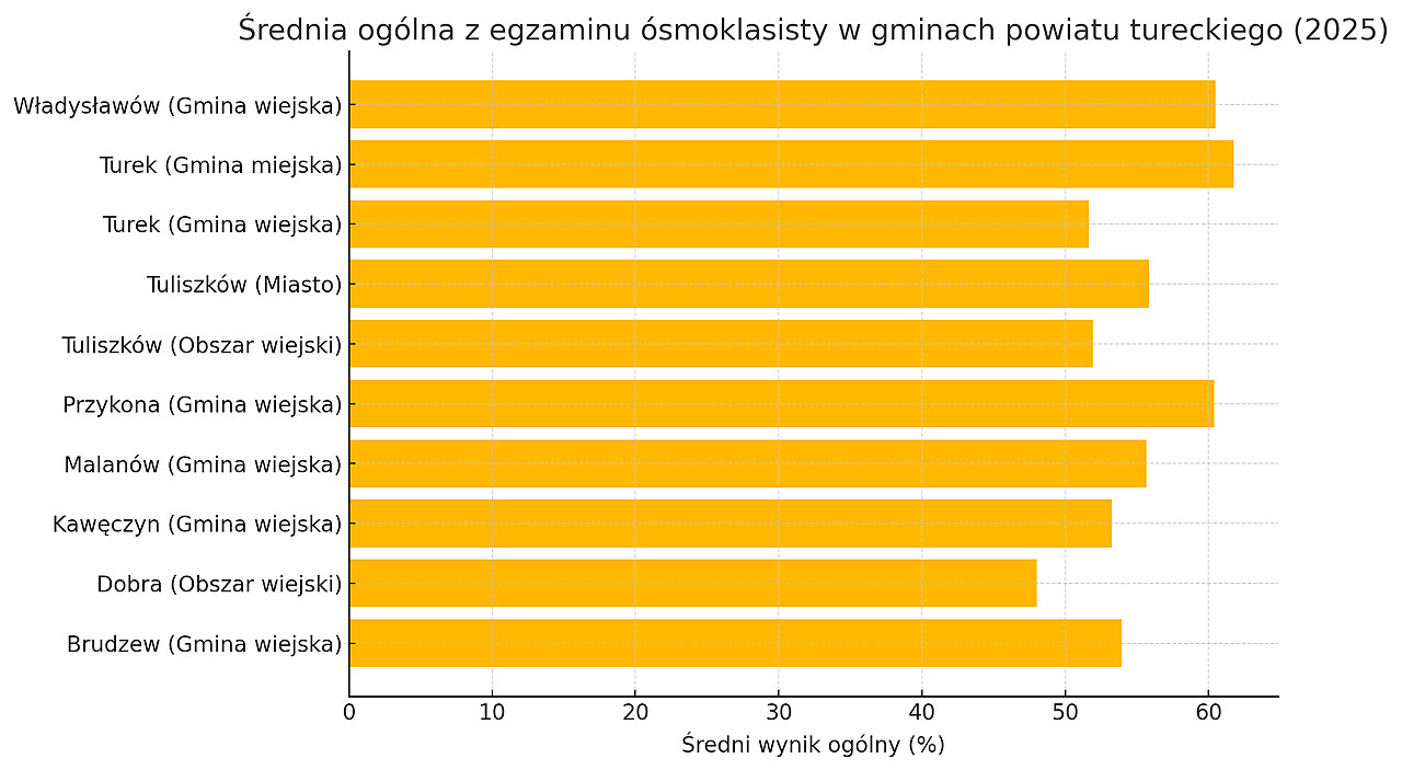 Wyniki egzaminów ósmoklasisty w powiecie tureckim uwidoczniły nie tylko potencjał uczniów z Turku i kilku mniejszych miejscowości, ale też potrzebę intensyfikacji działań wspierających edukację w gminach, które osiągnęły słabsze rezultaty. Czy dodatkowe programy wyrównawcze i lepsze wyposażenie szkół mogłyby odmienić obraz przyszłorocznych wyników?