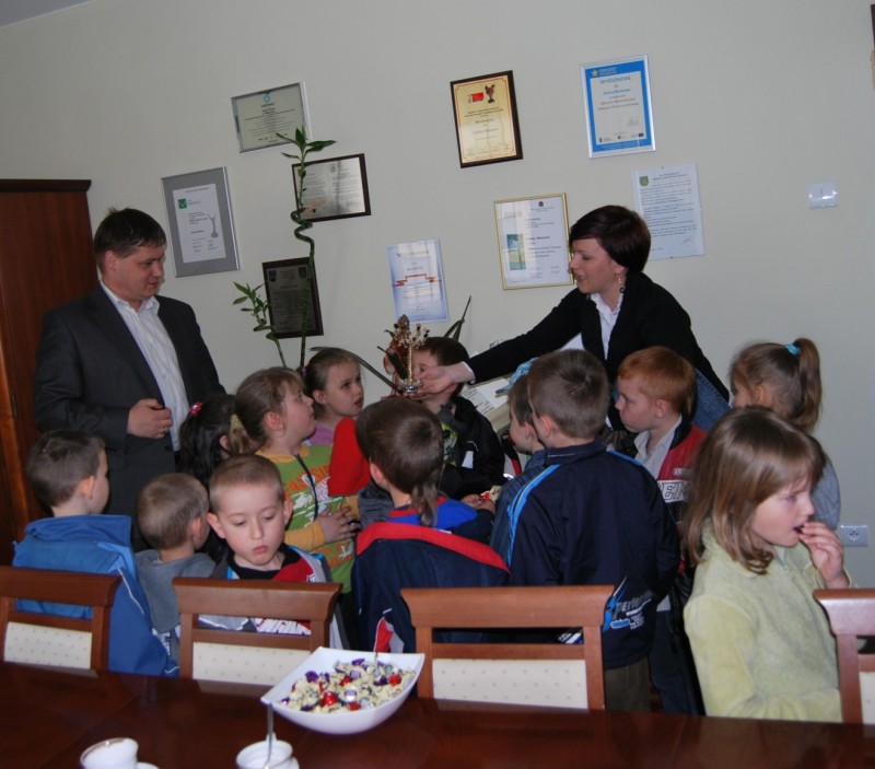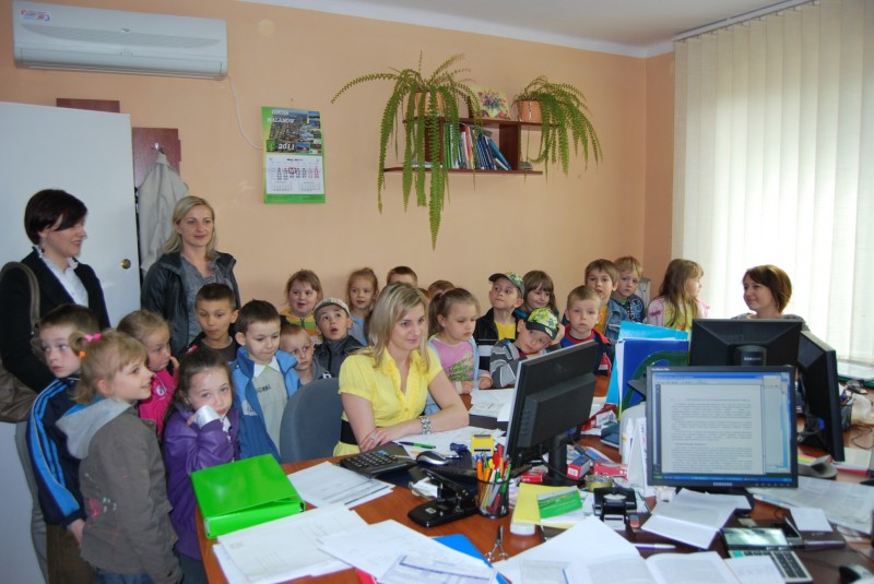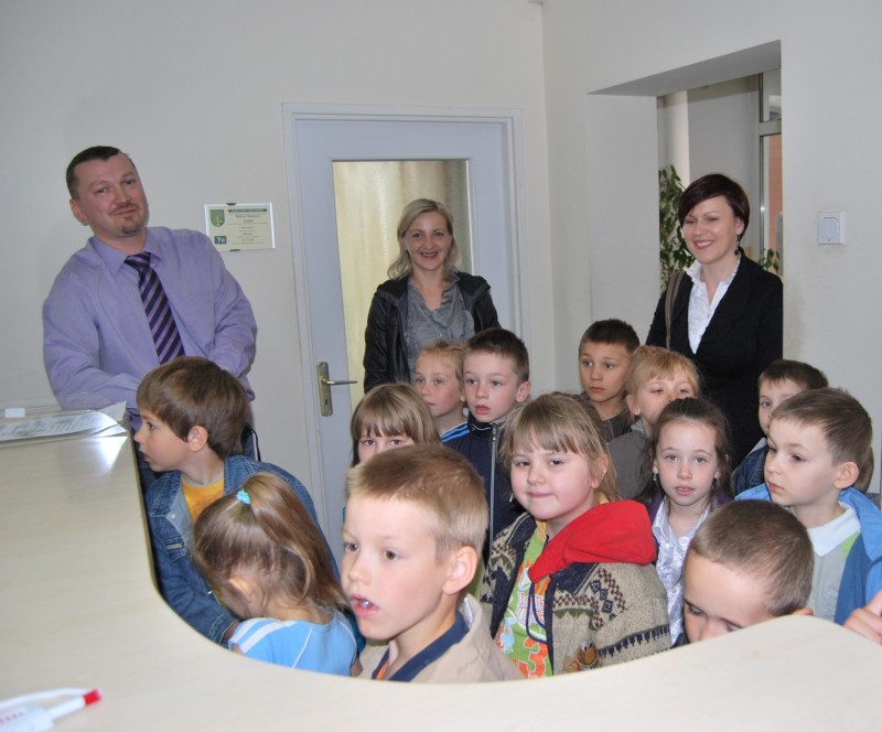 Przedszkolaki zostały przywitane przez Sekretarza Urzędu – Karola Adamka, który towarzyszył dzieciom podczas zwiedzania urzędu oraz przybliżył im zasady jego funkcjonowania. Maluchy dowiedziały się, m. in. jakie sprawy można załatwić w urzędzie oraz czym zajmują się zatrudnieni tam pracownicy.