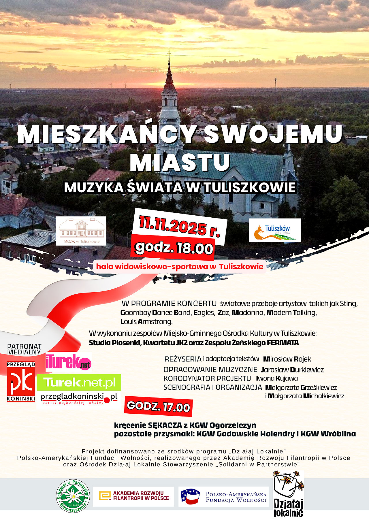 W Narodowe Święto Niepodległości, 11 listopada, o godzinie 18.00, hala widowiskowo-sportowa w Tuliszkowie wypełni się muzyką, patriotycznym duchem i nutą wolności. Koncert „Mieszkańcy swojemu Miastu. Muzyka świata w Tuliszkowie” będzie wyjątkowym widowiskiem przygotowanym przez Miejsko-Gminny Ośrodek Kultury w Tuliszkowie oraz grupę Tuliszkowiaki w ramach programu „Działaj Lokalnie” Polsko-Amerykańskiej Fundacji Wolności.