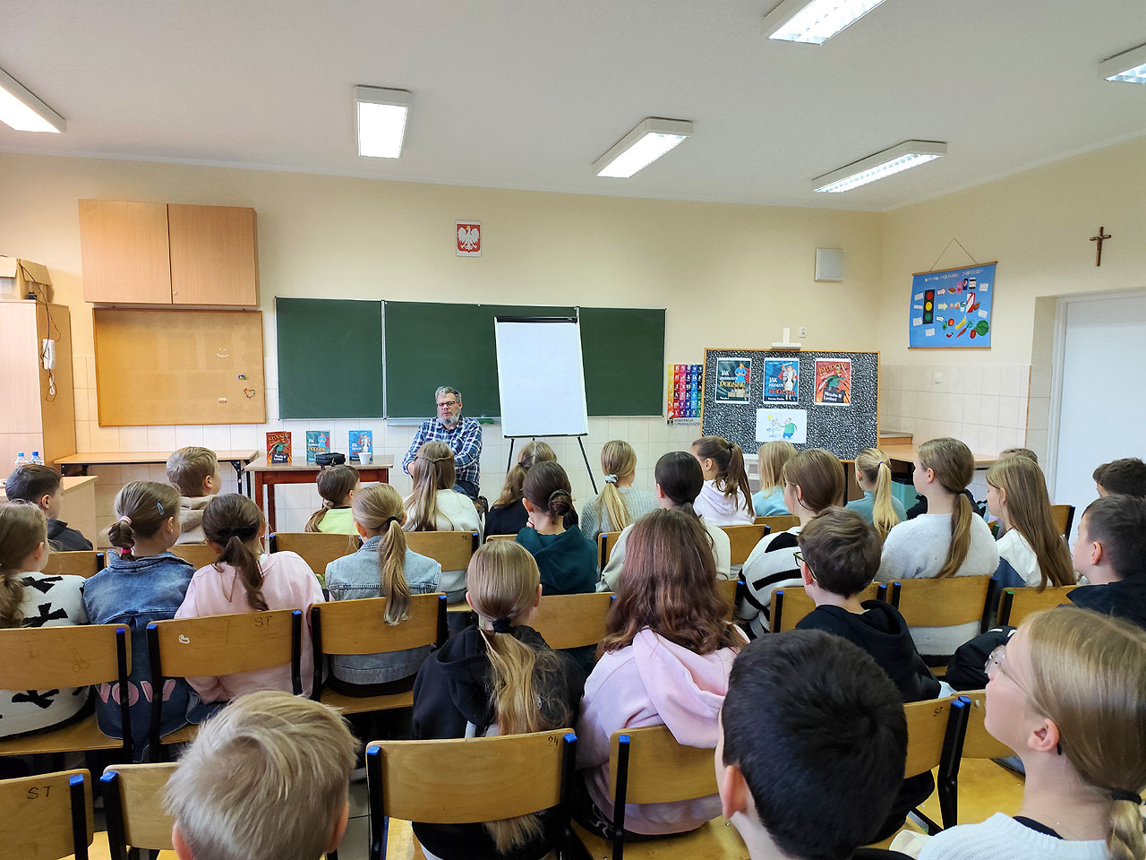 Po prelekcji uczniowie chętnie zadawali pytania dotyczące książek i inspiracji twórczych. Spotkanie zakończyło się możliwością zdobycia autografu i krótkiej rozmowy z autorem.