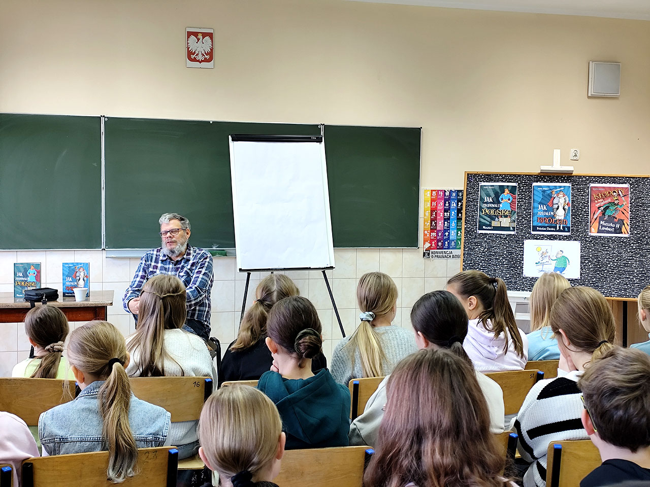 Podczas spotkania w angażujący sposób zaprezentował fragmenty swoich książek. W związku z przypadającym w 2025 tysiącleciem koronacji Bolesława Chrobrego nawiązywał głównie do książki „Jak zostałem królem". Dużą atrakcją była część poświęcona rysunkowi, podczas której autor na żywo demonstrował, jak tworzy ilustracje, zachęcając jednocześnie uczniów do rozwijania własnych talentów plastycznych.
