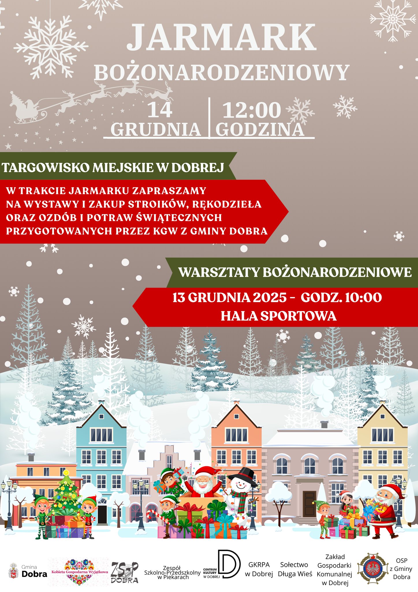 W niedzielę 14 grudnia o godz. 12.00 na targowisku miejskim w Dobrej rozpocznie się jarmark bożonarodzeniowy. Na stoiskach pojawią się dekoracje, rękodzieło, potrawy przygotowane przez KGW, choinki, karpie i lokalne wyroby, a o oprawę artystyczną zadbają zespoły oraz dzieci z miejscowych szkół.