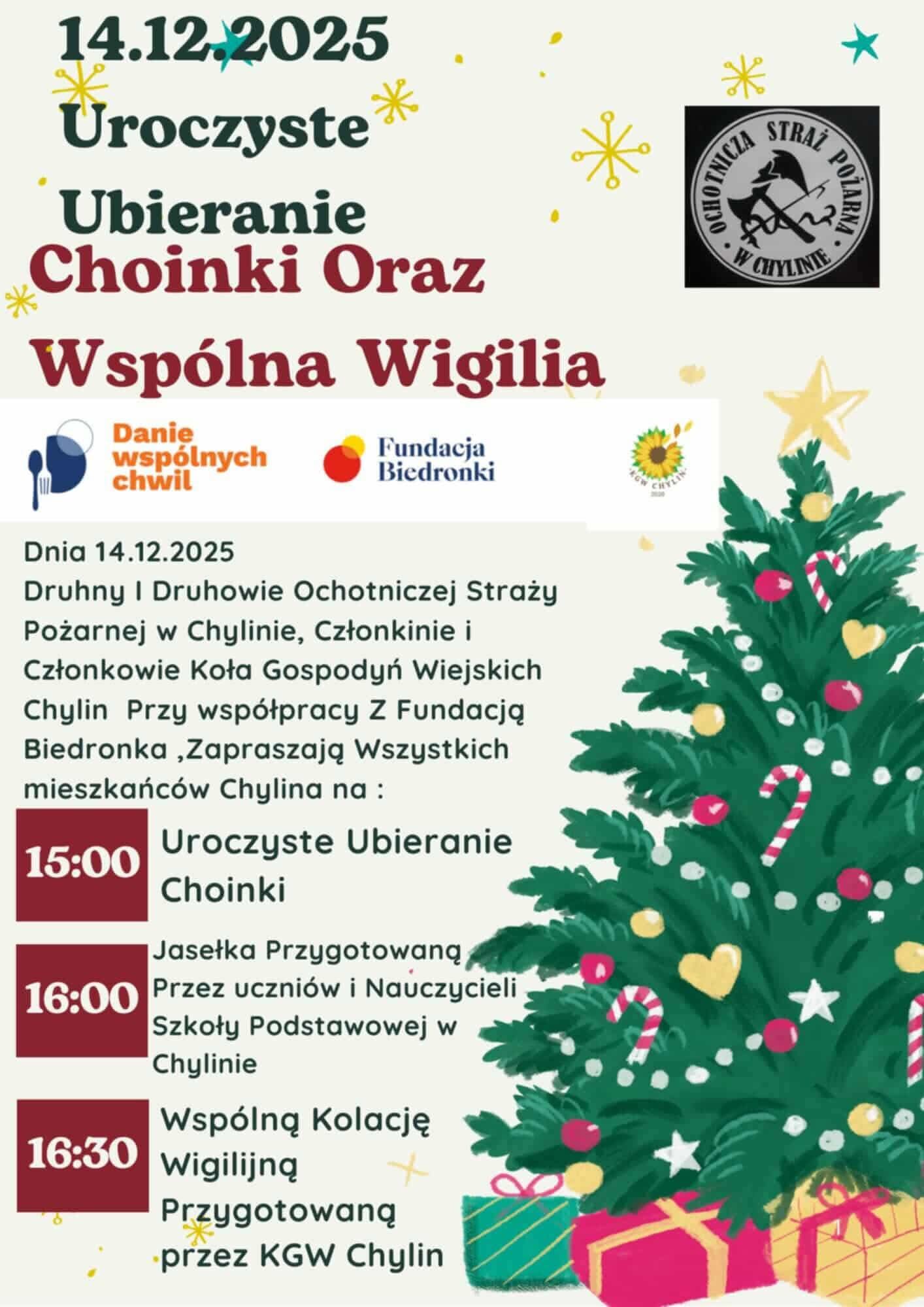 Uroczyste Ubieranie Choinki oraz Wspólna Wigilia odbędą się 14.12.2025 r. od godz. 15:00 w Chylinie, gdzie zaplanowano uroczyste ubieranie choinki o godz. 15:00, jasełka przygotowane przez uczniów i nauczycieli Szkoły Podstawowej w Chylinie o godz. 16:00 oraz wspólną kolację wigilijną o godz. 16:30, przygotowaną przez KGW Chylin, tworząc wyjątkowe spotkanie mieszkańców pełne świątecznej atmosfery i wspólnoty.