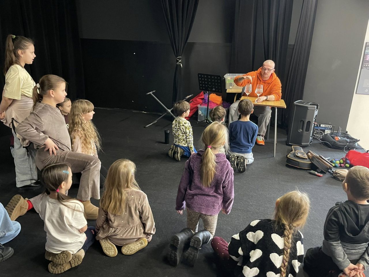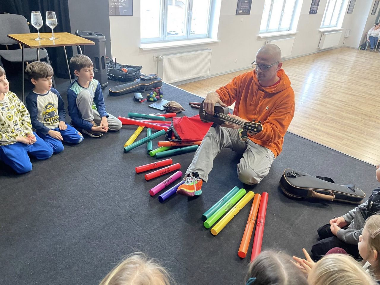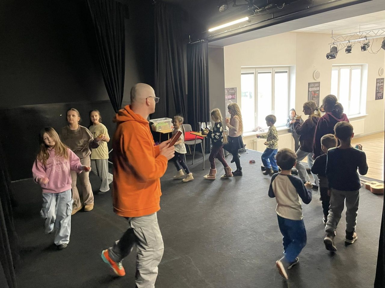 W czasie ferii odbyły się też ciekawe warsztaty muzyczne, prowadzone przez Michała Gąbkę. Ich uczestnicy bawili się muzyką tworząc zespół i odkrywali dźwięki różnymi zmysłami. Mieli okazję budować akompaniament z wykorzystaniem ukulele sopranowego, barytonowego, kieliszków z wodą, tongue drumu, klawesów, shakerów i bum bum rurek. Dzieci z ogromnym zaangażowaniem ćwiczyły poczucie rytmu, a przy tym było mnóstwo śmiechu i dobrej zabawy.