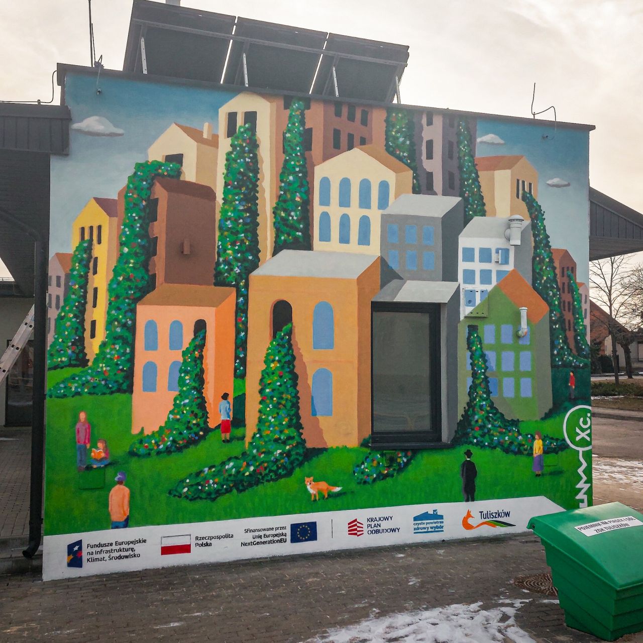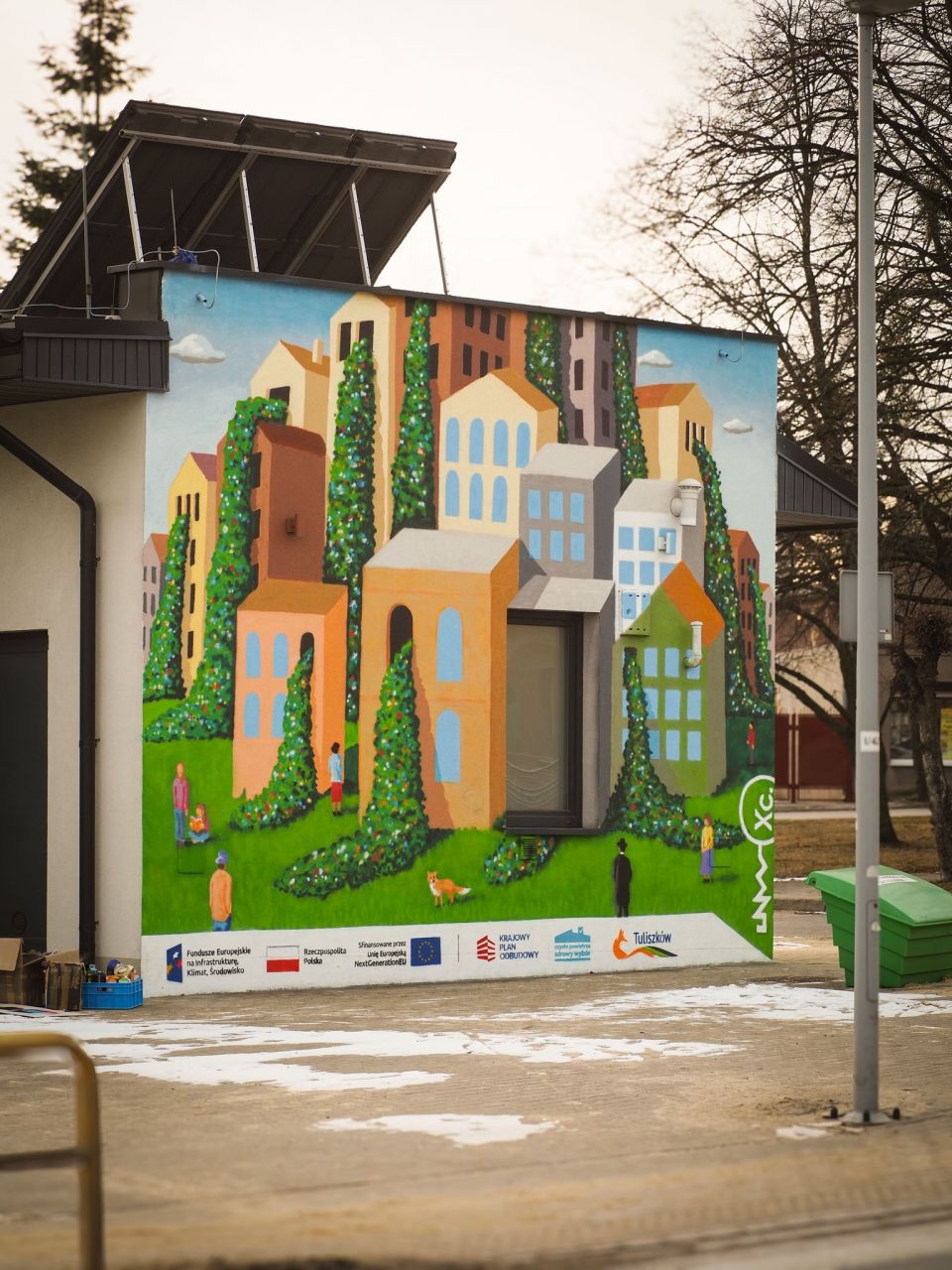 Mural przedstawia miasto jako żywy organizm – pełne warstw, pęknięć i dróg prowadzących w górę. U jego podstawy znajduje się zieleń, co przypomina o równowadze między naturą a urbanizacją. Z kolei wodospady kwiatów spływające z okien budowli symbolizują życie, odnowę i naturę przenikającą miejską przestrzeń. To opowieść o zmianie, odbudowie i nadziei, która ma zatrzymać i zastanowić przechodniów. Tak jak zastygłe na ścianie Biblioteki postacie, wpatrzone w kwiatospady. Na muralu nie mogło zabraknąć też lisa, który w Tuliszkowie ma przecież szczególne miejsce. Mural już teraz robi wrażenie, a co dopiero, gdy okalający go świat sam buchnie kolorami.