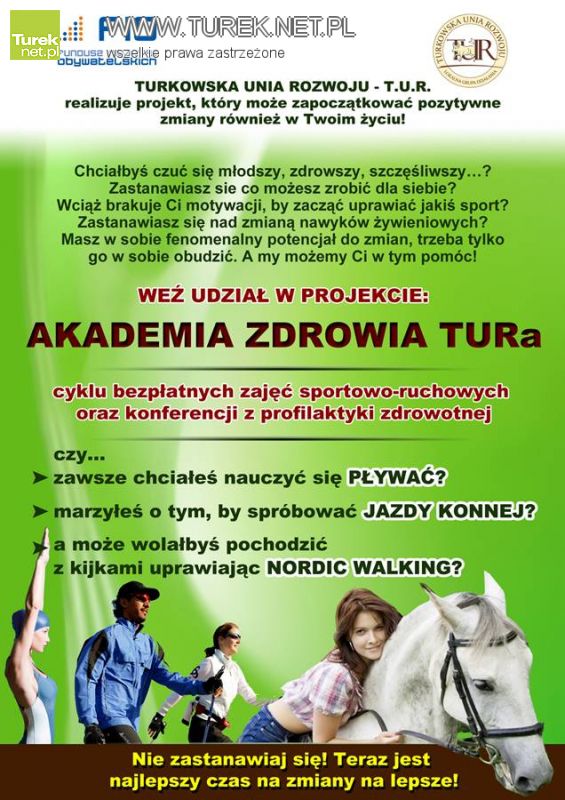 Osoby, które wyrażą chęć uczestnictwa w „AKADEMII ZDROWIA TURa”, będą miały okazję spełnić swoje sportowe marzenia – bezpłatnie nauczyć się pływać, spróbować jazdy konnej, a także zapoznać się z coraz popularniejszą formą aktywności, jaką jest nordic-walking. Szereg działań związanych ze sportową aktywizacją zwieńczy konferencja poświęcona zagadnieniom wpływu aktywnego wypoczynku oraz zdrowego odżywiania na samopoczucie człowieka.