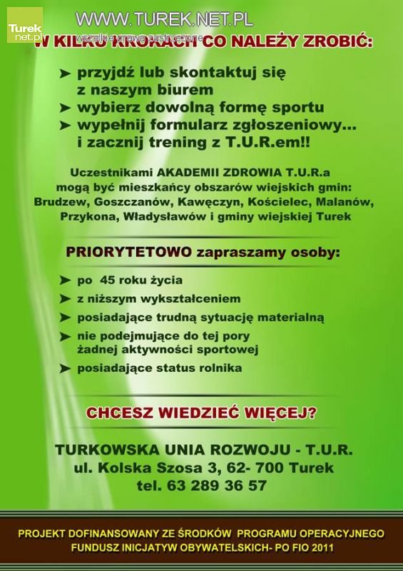Projekt dofinansowany jest ze środków Programu Operacyjnego Fundusz Inicjatyw Obywatelskich. Aby wziąć udział w „AKADEMII ZDROWIA TURa” należy skontaktować się z biurem Turkowskiej Unii Rozwoju - T.U.R - ul. Kolska Szosa 3, 62-700 Turek, tel. 63 289 36 57.