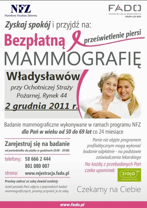 Jako, że mądrzej jest zapobiegać chorobie, niż później ją leczyć, 2 grudnia mieszkanki gminy Władysławów będą miały okazję sprawdzić stan swojego zdrowia.
