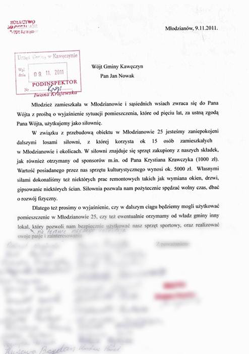 Młodzi mają pretensje do wójta o to, że nie spełnił swych obietnic. – Te pomieszczenia były obiecane, gdy zaczęło się tworzenie CIS {Centrum Integracji Społecznej - przyp. red]. Wójt mówił na zebraniach, że to będzie dla wsi. My zrobiliśmy w tym jednym pomieszczeniu coś właśnie dla młodzieży, a sąsiadująca część miała być np. do organizowania zebrań czy imprez – informuje jeden z mieszkańców. Inny z zainteresowanych mówi wprost, jaką rolę miała zamknięta siłownia: – To miał być taki klub sportowy. Każdy mógł się czymś zająć. Przecież lepiej chyba poćwiczyć, niż np. chlać pod sklepem, jak często się to widzi na wioskach. To było miejsce, gdzie można było się spotkać, porozmawiać i potrenować.