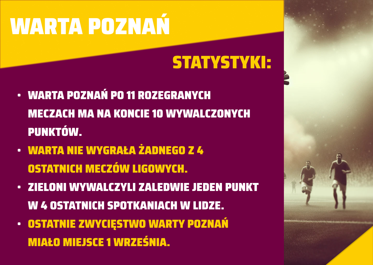 Ostatnie tygodnie nie są łatwe dla drugiego klubu z Poznania, czyli Warty. Piłkarze tego zespołu po 11 rozegranych meczach mają na koncie zaledwie 10 wywalczonych punktów. Zieloni aktualnie plasują się jeszcze nad strefą spadkową, jednak ich przewaga nad Puszczą Niepołomice, to już zaledwie jeden punkt. W ostatnim spotkaniu ligowym Warta Poznań zremisowała na wyjeździe z Koroną Kielce. Podopieczni Dawida Szulczka po zakończeniu reprezentacyjnej przerwy zmierzą się na wyjeździe ze Stalą Mielec.