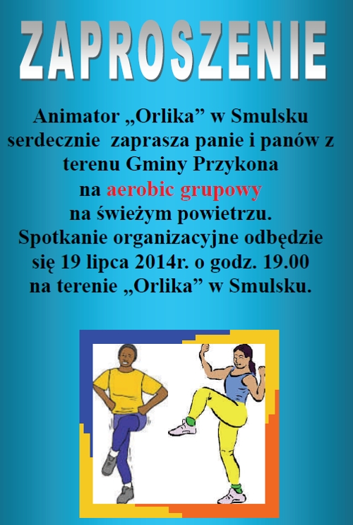 Grupowy aerobic na świeżym powietrzu na pewno będzie doskonałym rozwiązaniem dla tych, którzy chcą zadbać o zdrowie i dobre samopoczucie. Zajęcia będą przeznaczone zarówno dla pań jak i dla panów. Spotkanie organizacyjne odbędzie się 19 lipca o godz. 19.00 na terenie „Orlika” w Smulsku.