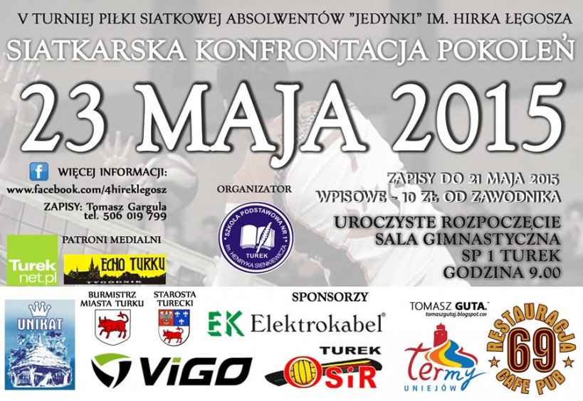 Po raz kolejny absolwenci Szkoły Podstawowej nr 1 w Turku - i nie tylko - spotkają się podczas Turnieju Piłki Siatkowej ku pamięci wybitnego nauczyciela wf - Hieronima Łęgosza. Turniej rozegrany zostanie w dwóch kategoriach: kobiet i mężczyzn. Mecze odbędą się w sali gimnastycznej SP 1 w Turku oraz I LO (w przypadku dużej ilości zespołów). Najlepsi siatkarze otrzymają puchar przechodni, medale i dyplomy, a dla wszystkich uczestników przewidziane są nagrody rzeczowe. Organizator przewiduje nagrody rzeczowe dla najstarszego i najmłodszego zawodnika turnieju, nagrodę FAIR-PLAY, nagrodę dla MVP.