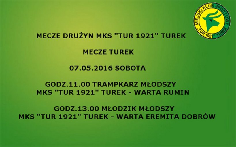 Już jutro na stadionie 1000-lecia w Turku odbędą się mecze drużyn MKS „TUR 1921” Turek. O godz. 11:00 w grupie młodzieżowej Trampkarz Młodszy zagrają MKS „TUR 1921” Turek – Warta Rumin, następnie o godz. 13:00 w kategorii Młodzik Młodszy powalczą MKS „TUR 1921” Turek – Warta Eremita Dobrów.