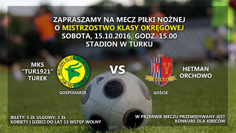 Zapraszamy na kolejny mecz piłki nożnej w ramach walki o mistrzostwo klasy okręgowej. W sobotę 15 października na stadionie 1000-lecia w Turku zmierzą się MKS Tur 1921 Turek i Hetman Orchowo. Początek spotkania o godz. 15:00, w przerwie meczu przewidywany jest konkurs dla kibiców. Cena biletu to jedyne 5 zł, ulgowy 3 zł, kobiety i dzieci do lat 13 – wstęp wolny.