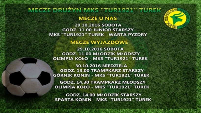 W sobotę, 29 października o godz. 11:00 na Stadionie 1000-lecia w Turku juniorzy starsi MKS „TUR1921” TUREK zagrają mecz z drużyną WARTA PYZDRY.