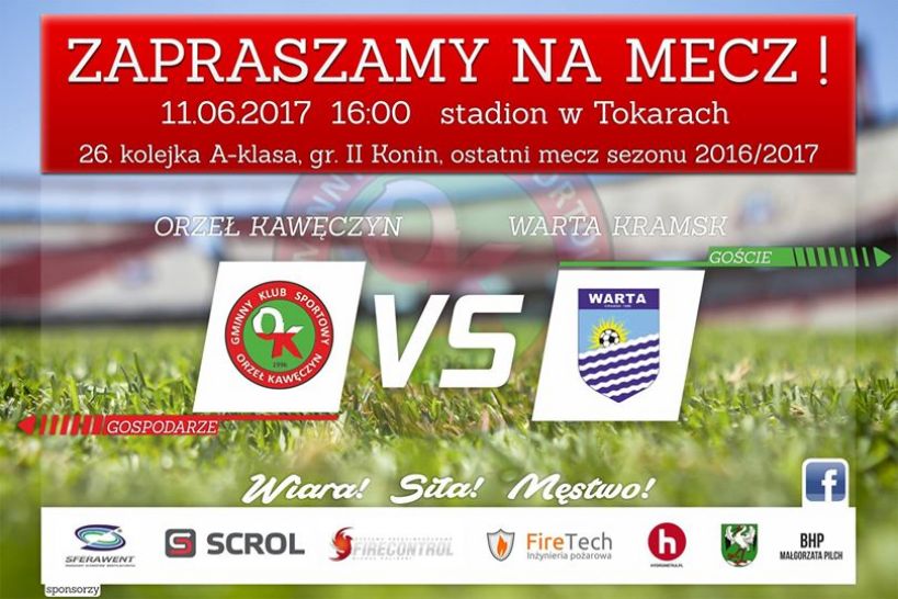 Zapraszamy na kolejny mecz piłki nożnej w ramach rozgrywek konińskiej A-klasy. W niedzielę 11 czerwca na stadionie w Tokarach zmierzą się Orzeł Kawęczyn i Warta Kramsk. Będzie to dla tych zespołów ostatni mecz w sezonie 2016/2017. Początek spotkania o godz. 16:00.